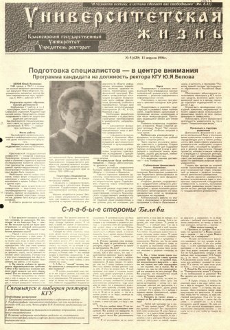 Университетская жизнь : газета/ Красноярский государственный университет. - Красноярск : КрасГУ, 1972 - - 2006 1996г. N 5 (629) (11 апреля) Полный текст ( 25.0 Мб; PDF). Ресурс свободного доступа