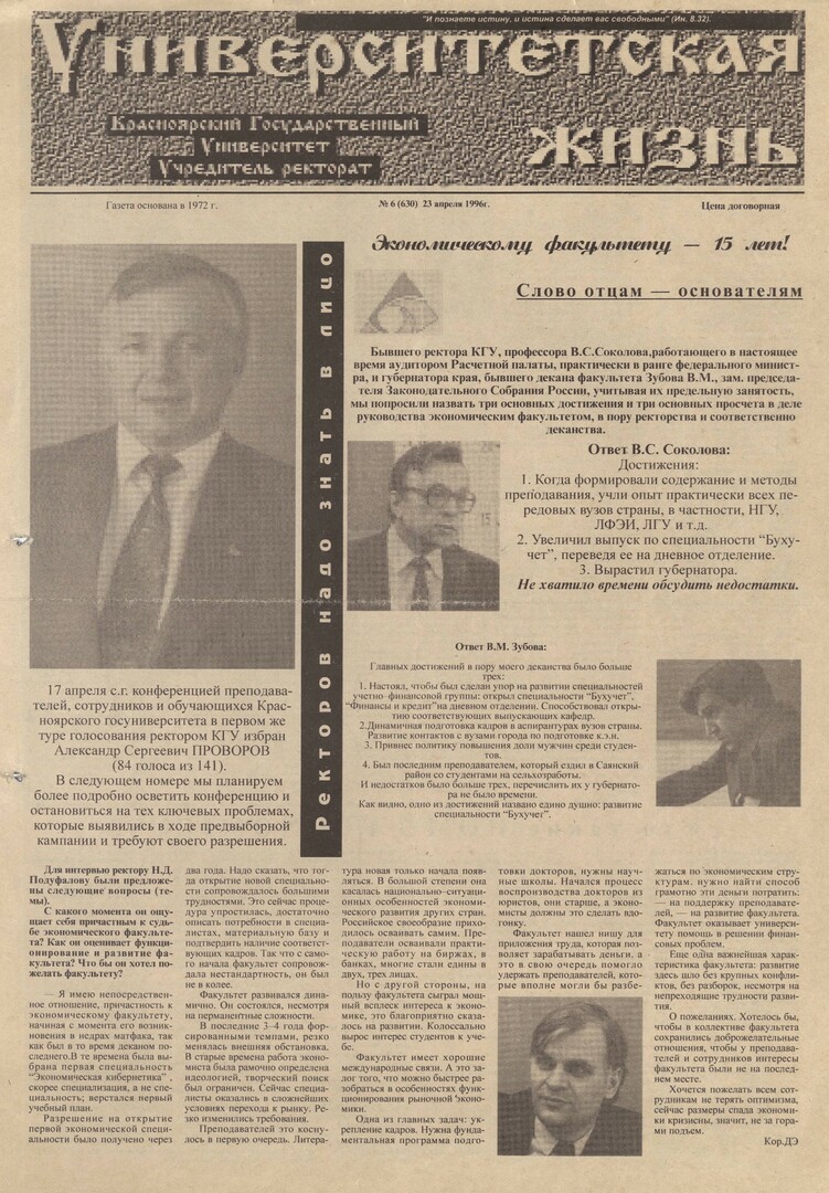 Университетская жизнь : газета/ Красноярский государственный университет. - Красноярск : КрасГУ, 1972 - - 2006 1996г. N 6 (630) (23 апреля) Полный текст ( 10.0 Мб; PDF). Ресурс свободного доступа