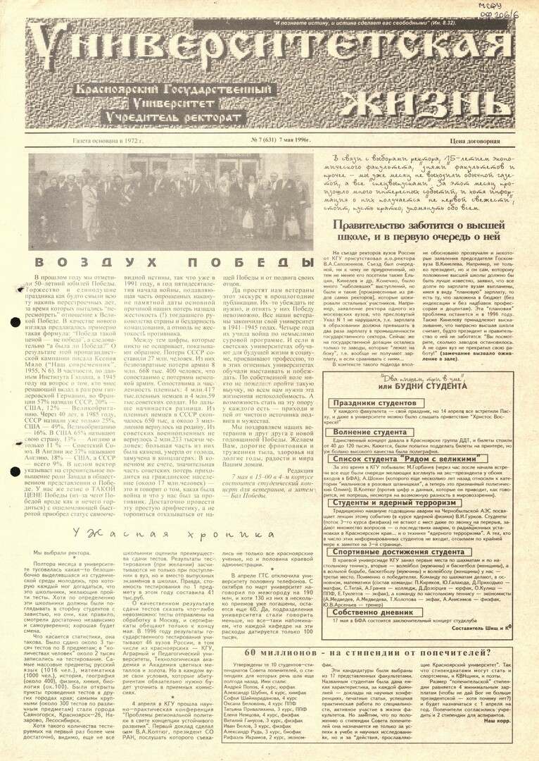 Университетская жизнь : газета/ Красноярский государственный университет. - Красноярск : КрасГУ, 1972 - - 2006 1996г. N 7 (631) (7 мая) Полный текст ( 18.4 Мб; PDF). Ресурс свободного доступа