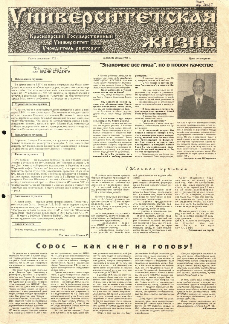 Университетская жизнь : газета/ Красноярский государственный университет. - Красноярск : КрасГУ, 1972 - - 2006 1996г. N 8 (632) (28 мая) Полный текст ( 34.3 Мб; PDF). Ресурс свободного доступа