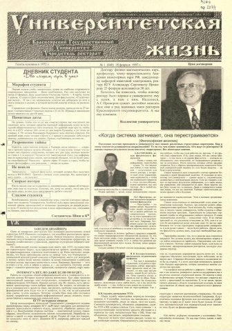 Университетская жизнь : газета/ Красноярский государственный университет. - Красноярск : КрасГУ, 1972 - - 2006 1997г. N 1 (640) (18 февраля) Полный текст ( 12.5 Мб; PDF). Ресурс свободного доступа