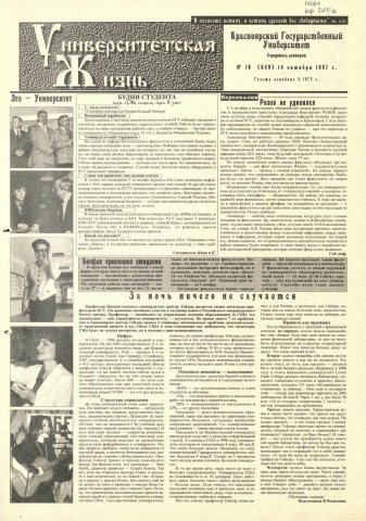 Университетская жизнь : газета/ Красноярский государственный университет. - Красноярск : КрасГУ, 1972 - - 2006 1997г. N 10 (649) (14 октября) Полный текст ( 12.6 Мб; PDF). Ресурс свободного доступа