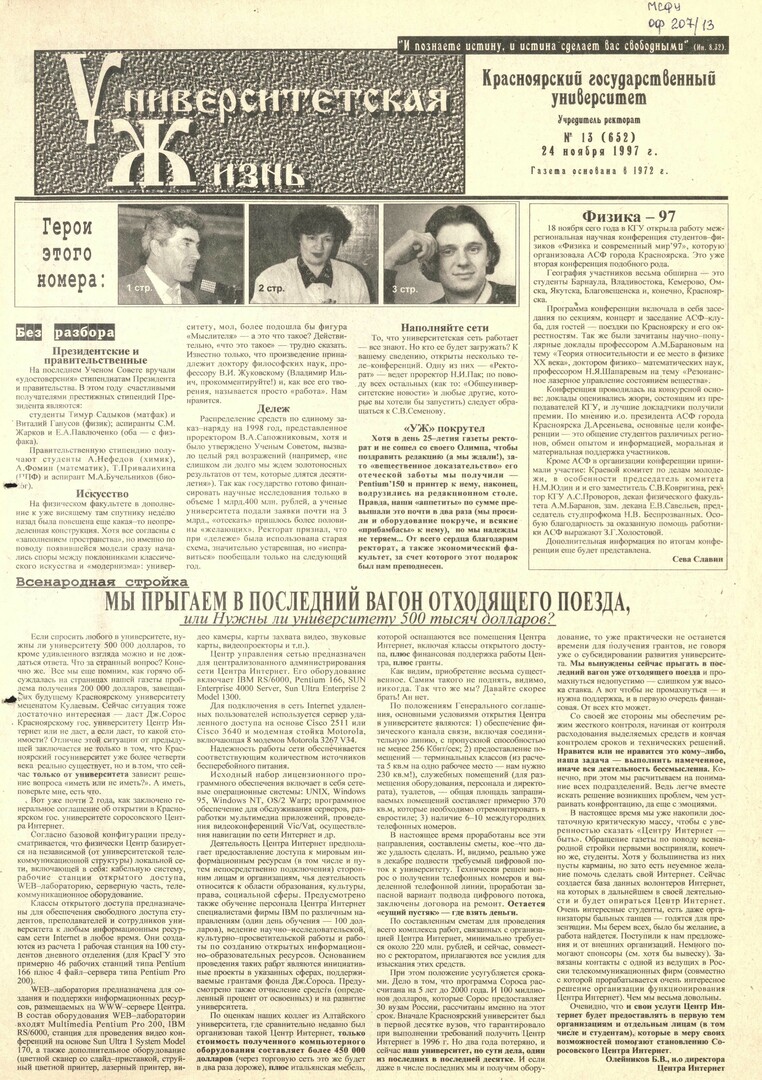 Университетская жизнь : газета/ Красноярский государственный университет. - Красноярск : КрасГУ, 1972 - - 2006 1997г. N 13 (652) (24 ноября) Полный текст ( 11.7 Мб; PDF). Ресурс свободного доступа
