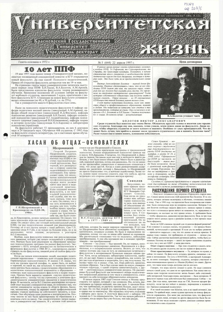 Университетская жизнь : газета/ Красноярский государственный университет. - Красноярск : КрасГУ, 1972 - - 2006 1997г. N 5 (644) (22 апреля) Полный текст ( 17.9 Мб; PDF). Ресурс свободного доступа