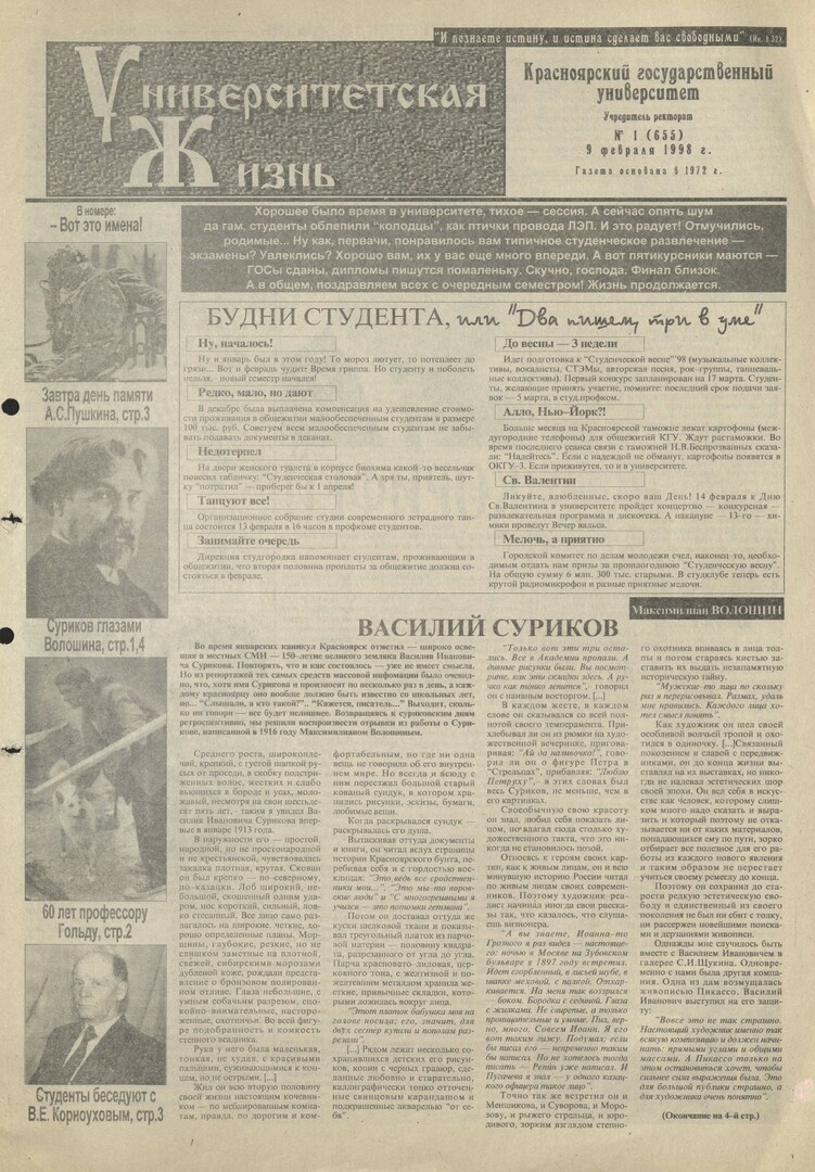 Университетская жизнь : газета. 1998 г. № 1 (655) (9 февраля)