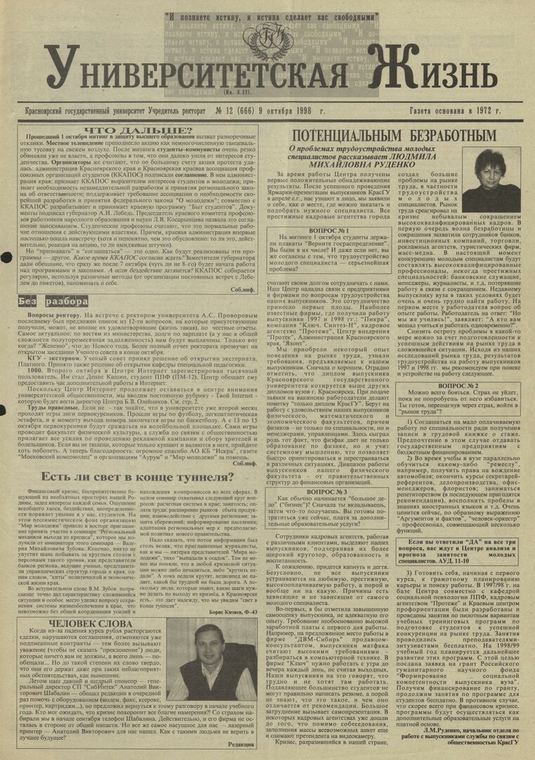 Университетская жизнь : газета/ Красноярский государственный университет. - Красноярск : КрасГУ, 1972 - - 2006 1998г. N 12 (666) (9 октября) Полный текст ( 10.4 Мб; PDF). Ресурс свободного доступа