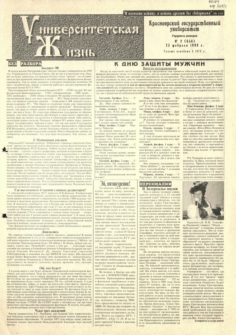 Университетская жизнь : газета/ Красноярский государственный университет. - Красноярск : КрасГУ, 1972 - - 2006 1998г. N 2 (656) (23 февраля) Полный текст ( 12.8 Мб; PDF). Ресурс свободного доступа
