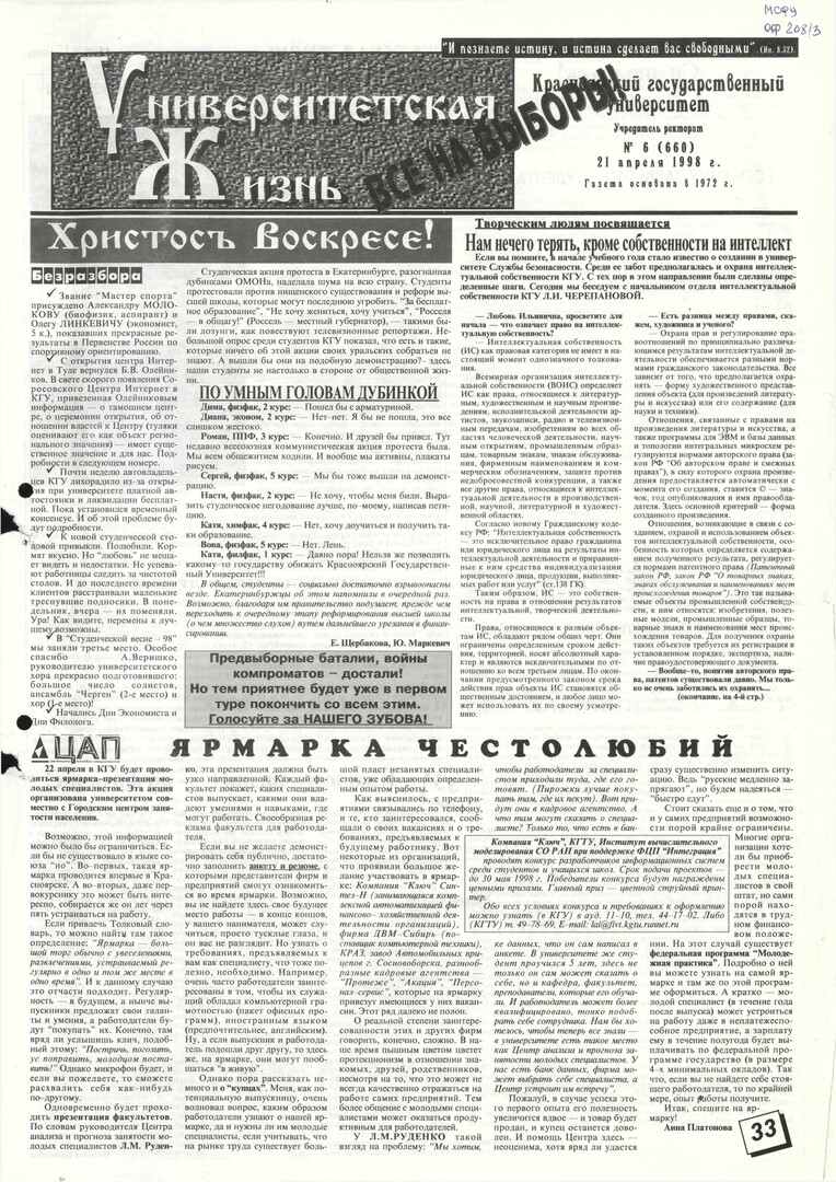 Университетская жизнь : газета/ Красноярский государственный университет. - Красноярск : КрасГУ, 1972 - - 2006 1998г. N 6 (660) (21 апреля) Полный текст ( 11.9 Мб; PDF). Ресурс свободного доступа