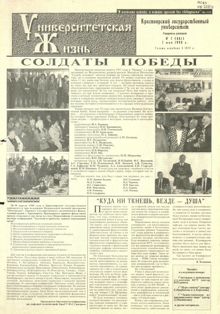 Университетская жизнь : газета. 1998 г. № 7 (661) (7 мая)