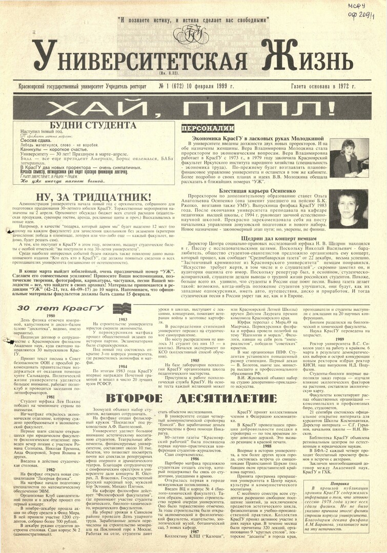 Университетская жизнь : газета/ Красноярский государственный университет. - Красноярск : КрасГУ, 1972 - - 2006 1999г. N 1 (672) (10 февраля) Полный текст ( 16.8 Мб; PDF). Ресурс свободного доступа