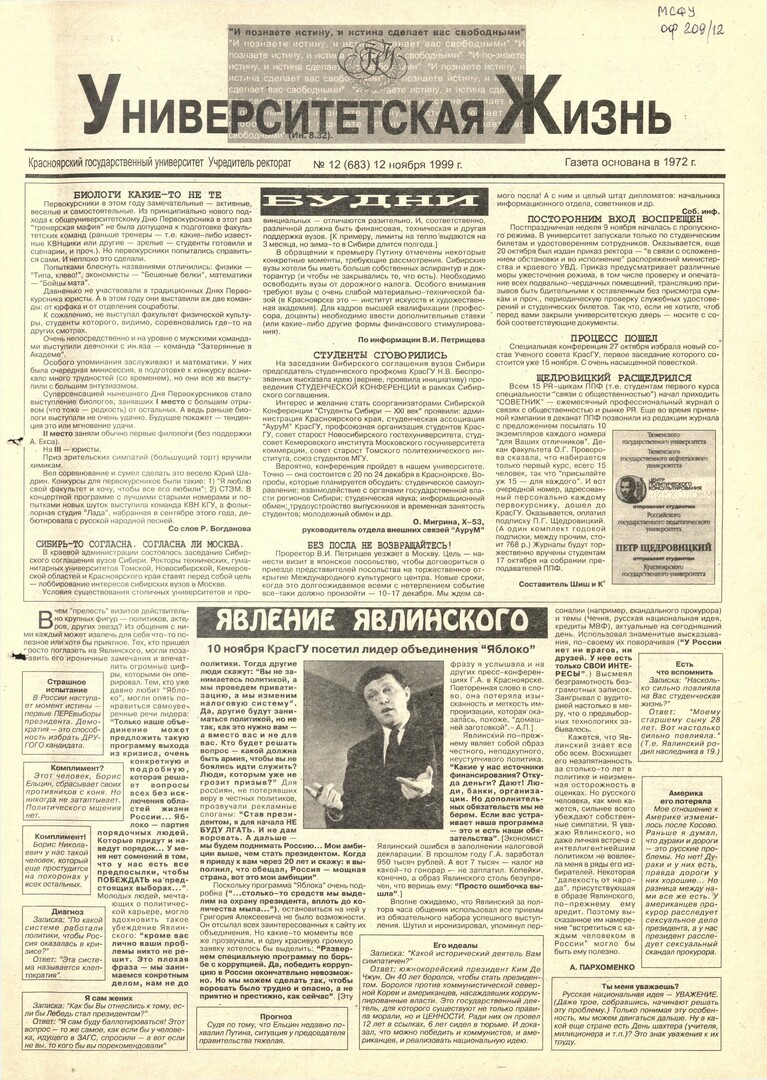 Университетская жизнь : газета/ Красноярский государственный университет. - Красноярск : КрасГУ, 1972 - - 2006 1999г. N 12 (683) (12 ноября) Полный текст ( 19.6 Мб; PDF). Ресурс свободного доступа