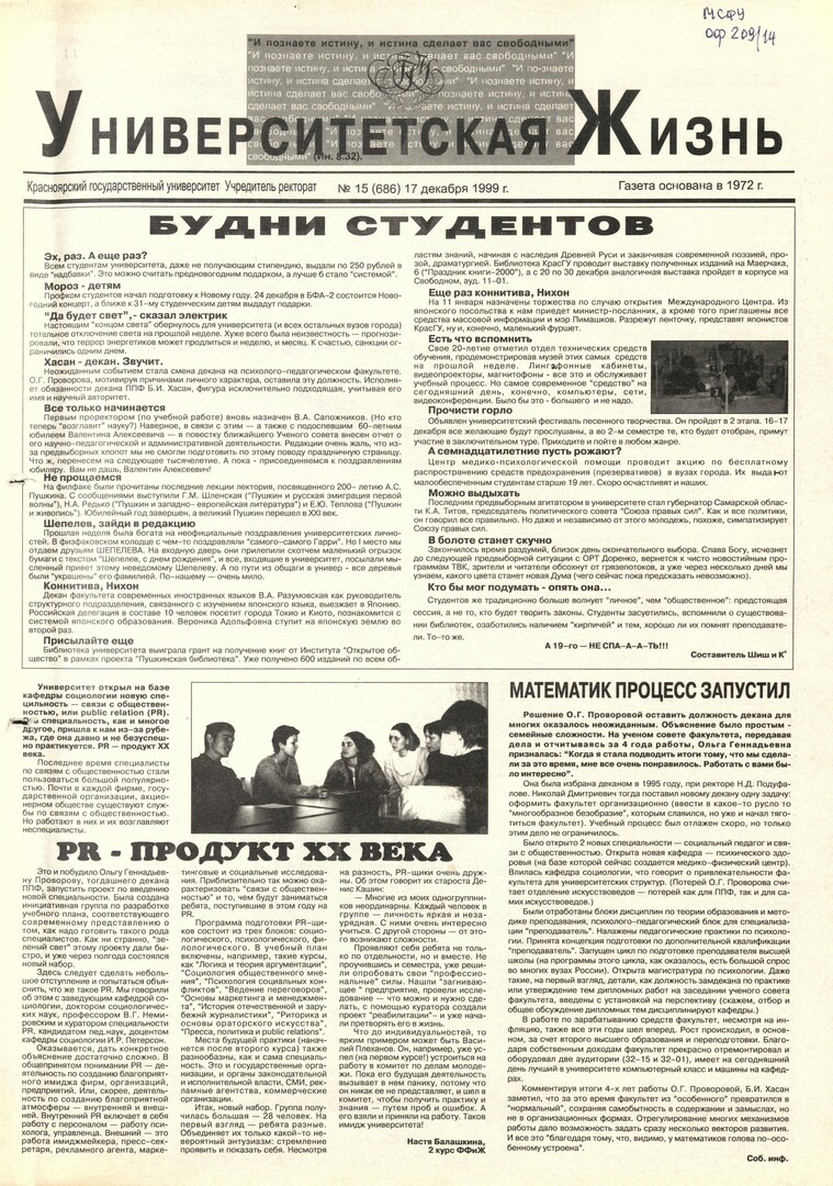 Университетская жизнь : газета/ Красноярский государственный университет. - Красноярск : КрасГУ, 1972 - - 2006 1999г. N 15 (686) (17 декабря) Полный текст ( 16.3 Мб; PDF). Ресурс свободного доступа