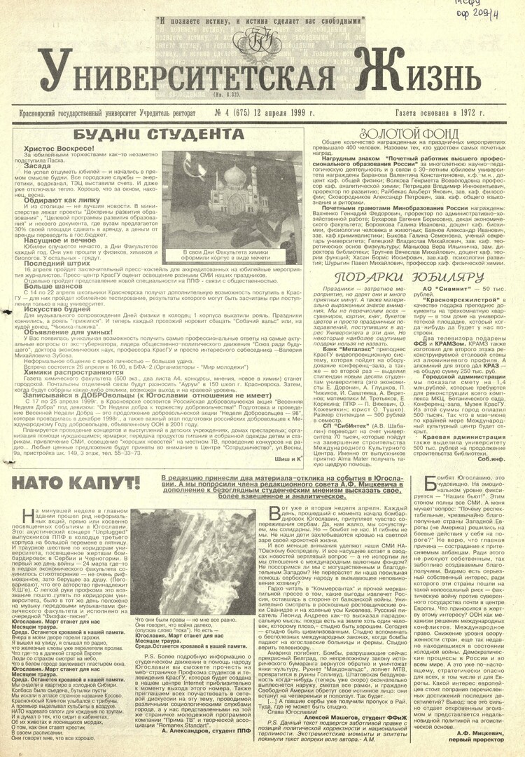 Университетская жизнь : газета/ Красноярский государственный университет. - Красноярск : КрасГУ, 1972 - - 2006 1999г. N 4 (675) (12 апреля) Полный текст ( 18.2 Мб; PDF). Ресурс свободного доступа