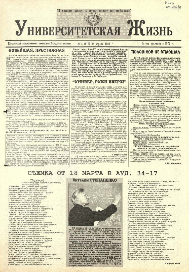 Университетская жизнь : газета. 1999 г. № 5 (676) (26 апреля)