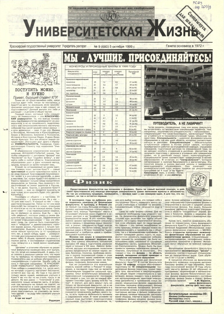 Университетская жизнь : газета/ Красноярский государственный университет. - Красноярск : КрасГУ, 1972 - - 2006 1999г. N 9 (680) (5 октября) Полный текст ( 16.7 Мб; PDF). Ресурс свободного доступа