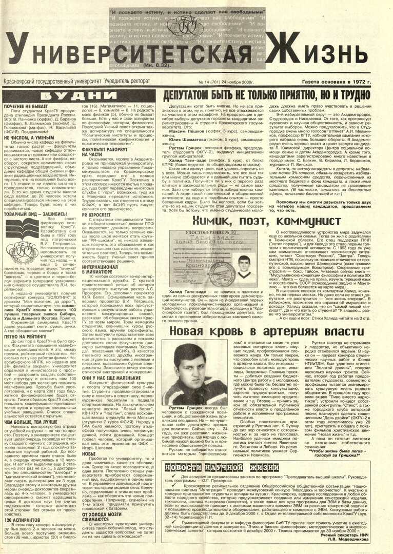 Университетская жизнь : газета/ Красноярский государственный университет. - Красноярск : КрасГУ, 1972 - - 2006 2000г. N 14 (701) (24 ноября) Полный текст ( 18.2 Мб; PDF). Ресурс свободного доступа