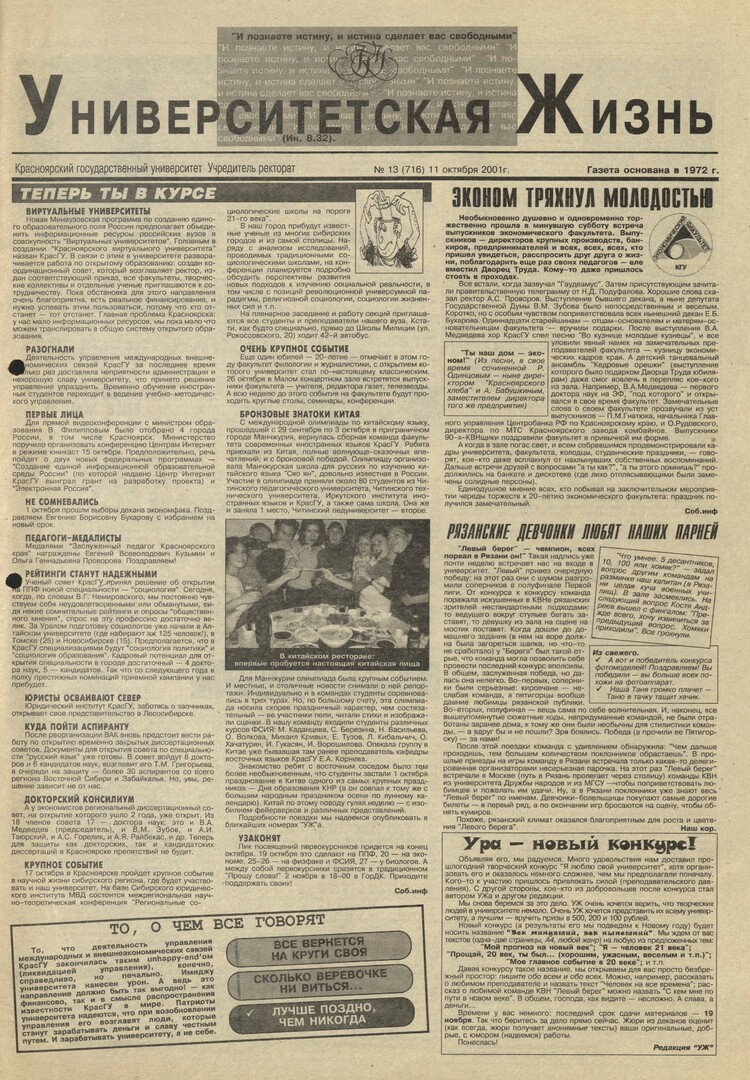 Университетская жизнь : газета/ Красноярский государственный университет. - Красноярск : КрасГУ, 1972 - - 2006 2001г. N 13 (716) (11 октября) Полный текст ( 11.2 Мб; PDF). Ресурс свободного доступа