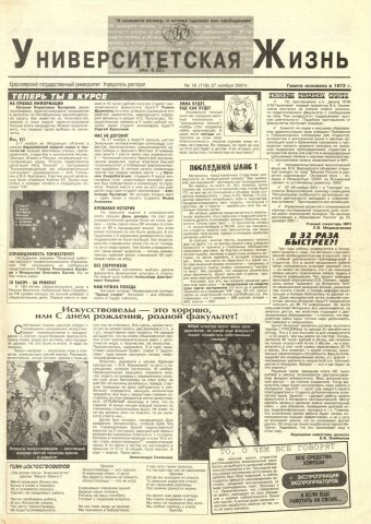 Университетская жизнь : газета/ Красноярский государственный университет. - Красноярск : КрасГУ, 1972 - - 2006 2001г. N 16 (719) (27 ноября) Полный текст ( 19.4 Мб; PDF). Ресурс свободного доступа