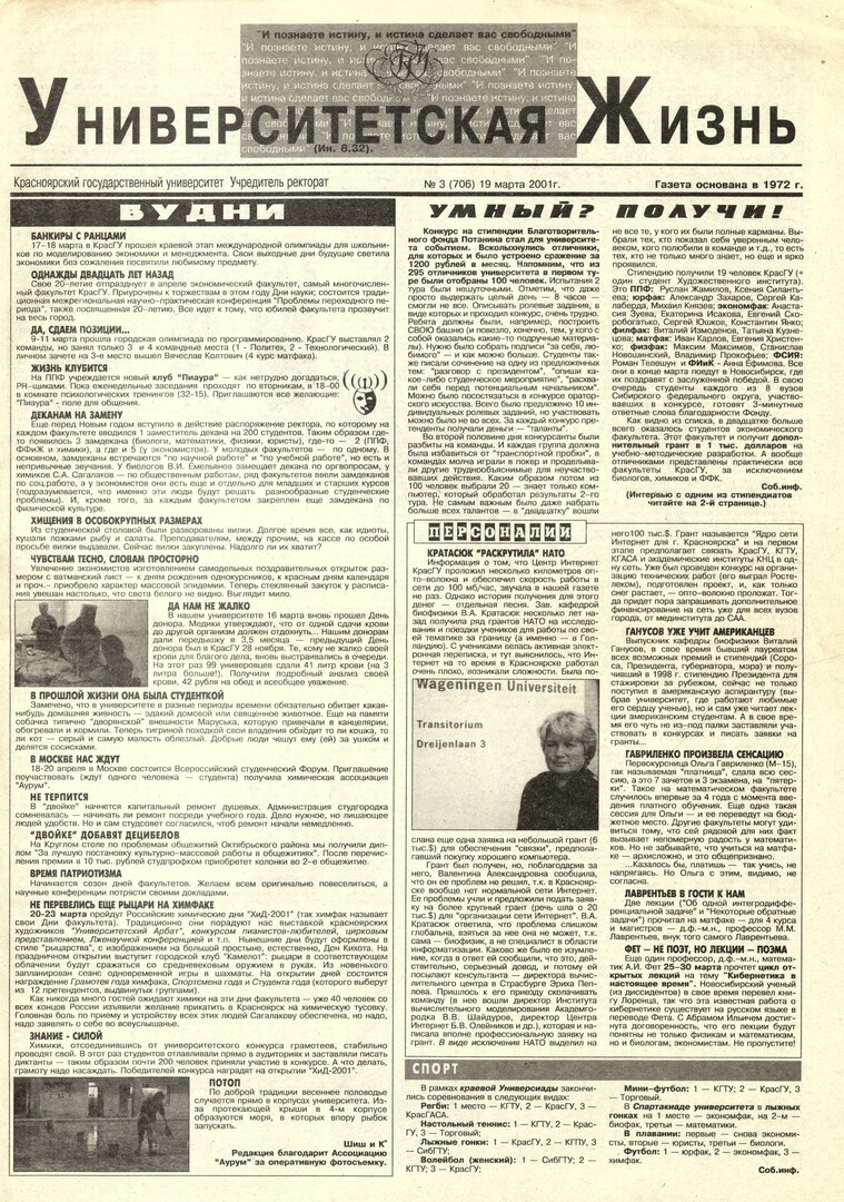 Университетская жизнь : газета/ Красноярский государственный университет. - Красноярск : КрасГУ, 1972 - - 2006 2001г. N 3 (706) (19 марта) Полный текст ( 20.4 Мб; PDF). Ресурс свободного доступа
