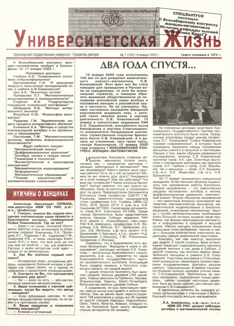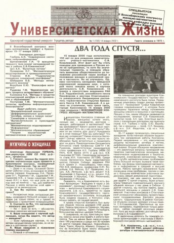 Университетская жизнь : газета/ Красноярский государственный университет. - Красноярск : КрасГУ, 1972 - - 2006 2002г. N 1 (722) (14 января) Полный текст ( 24.1 Мб; PDF). Ресурс свободного доступа