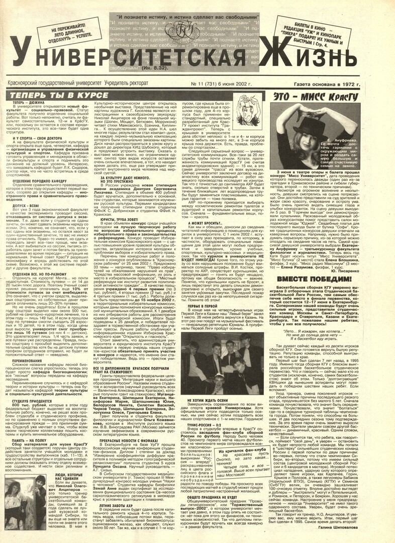 Университетская жизнь : газета/ Красноярский государственный университет. - Красноярск : КрасГУ, 1972 - - 2006 2002г. N 11 (731) (6 июня) Полный текст ( 20.6 Мб; PDF). Ресурс свободного доступа