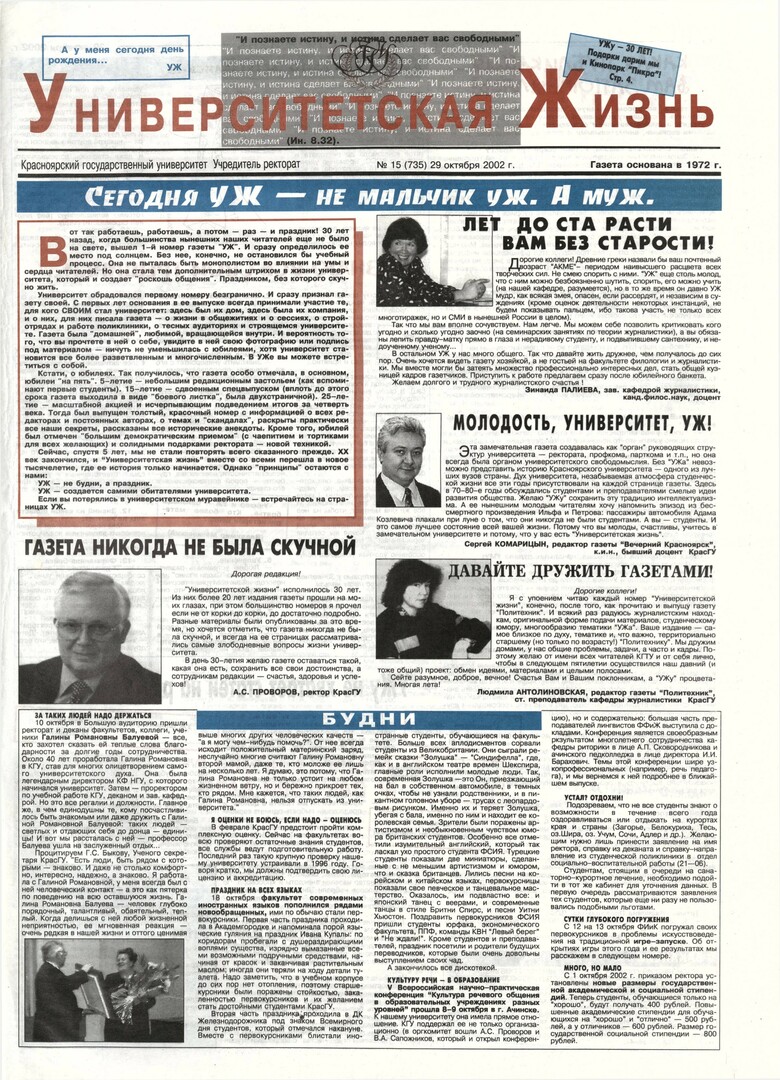 Университетская жизнь : газета/ Красноярский государственный университет. - Красноярск : КрасГУ, 1972 - - 2006 2002г. N 15 (735) (29 октября) Полный текст ( 17.5 Мб; PDF). Ресурс свободного доступа