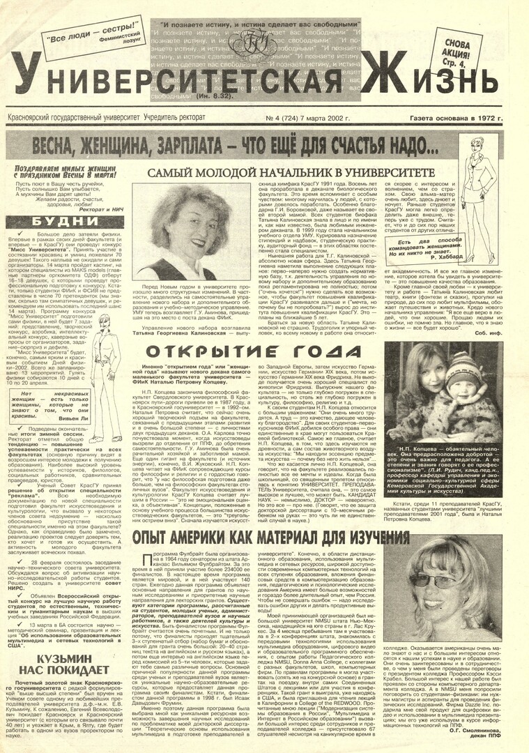 Университетская жизнь : газета/ Красноярский государственный университет. - Красноярск : КрасГУ, 1972 - - 2006 2002г. N 4 (724) (7 марта) Полный текст ( 18.6 Мб; PDF). Ресурс свободного доступа