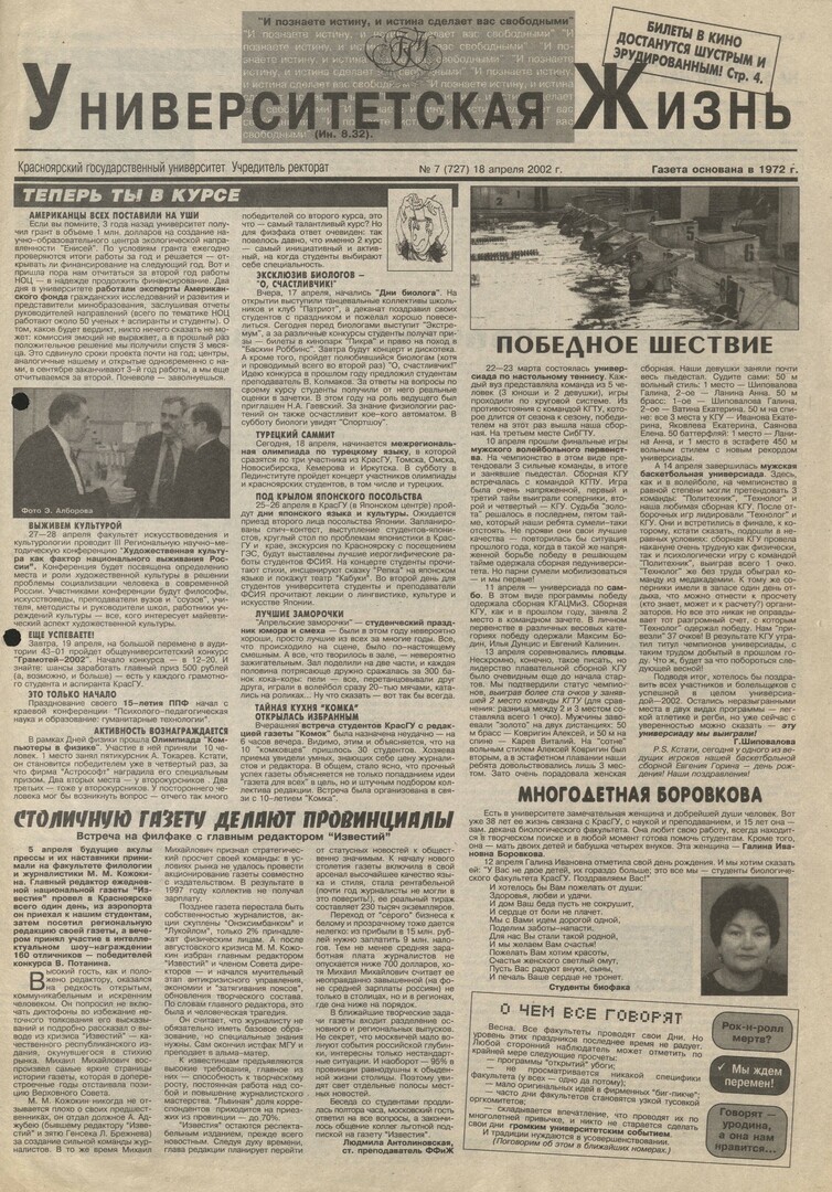 Университетская жизнь : газета/ Красноярский государственный университет. - Красноярск : КрасГУ, 1972 - - 2006 2002г. N 7 (727) (18 апреля) Полный текст ( 11.4 Мб; PDF). Ресурс свободного доступа