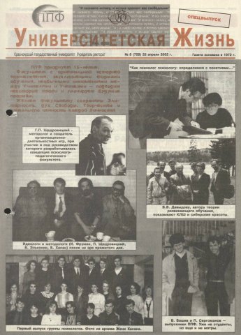 Университетская жизнь : газета/ Красноярский государственный университет. - Красноярск : КрасГУ, 1972 - - 2006 2002г. N 8 (728) (25 апреля) Полный текст ( 16.1 Мб; PDF). Ресурс свободного доступа