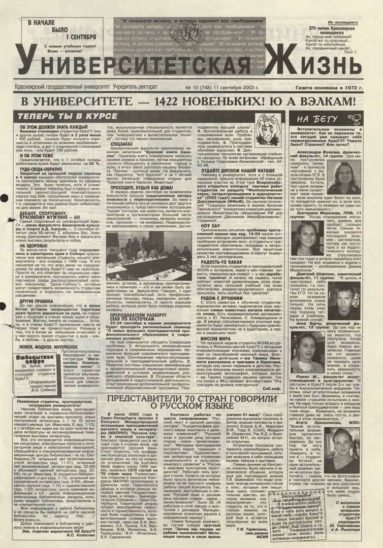 Университетская жизнь : газета/ Красноярский государственный университет. - Красноярск : КрасГУ, 1972 - - 2006 2003г. N 10 (748) (11 сентября) Полный текст ( 11.5 Мб; PDF). Ресурс свободного доступа