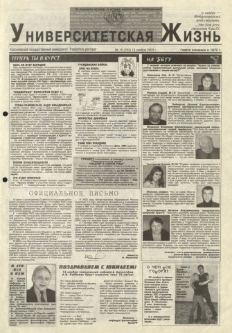 Университетская жизнь : газета/ Красноярский государственный университет. - Красноярск : КрасГУ, 1972 - - 2006 2003г. N 15 (753) (13 ноября) Полный текст ( 11.6 Мб; PDF). Ресурс свободного доступа