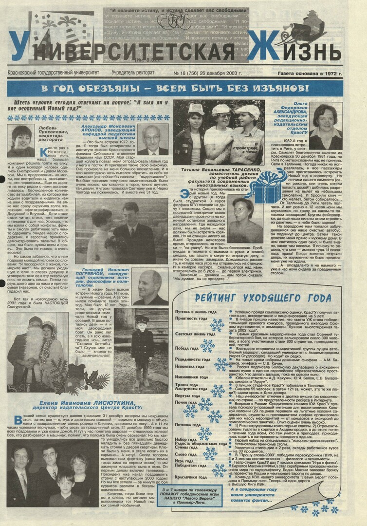 Университетская жизнь : газета/ Красноярский государственный университет. - Красноярск : КрасГУ, 1972 - - 2006 2003г. N 18 (756) (26 декабря) Полный текст ( 11.8 Мб; PDF). Ресурс свободного доступа