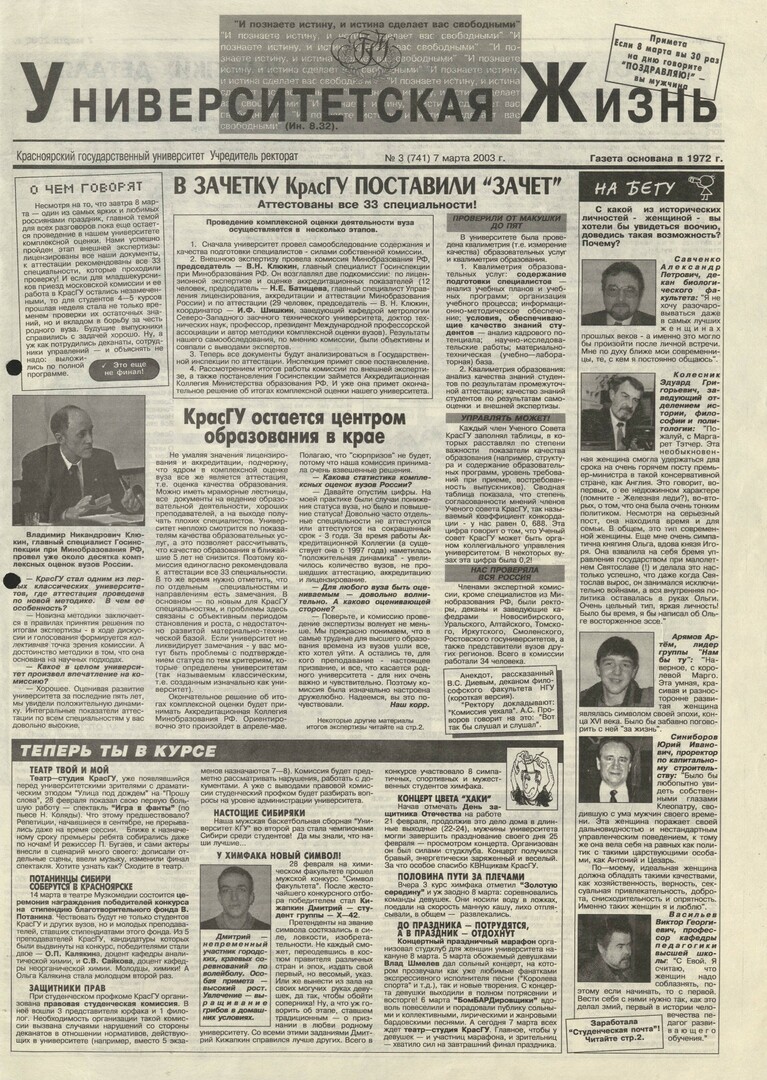 Университетская жизнь : газета/ Красноярский государственный университет. - Красноярск : КрасГУ, 1972 - - 2006 2003г. N 3 (741) (7 марта) Полный текст ( 11.5 Мб; PDF). Ресурс свободного доступа