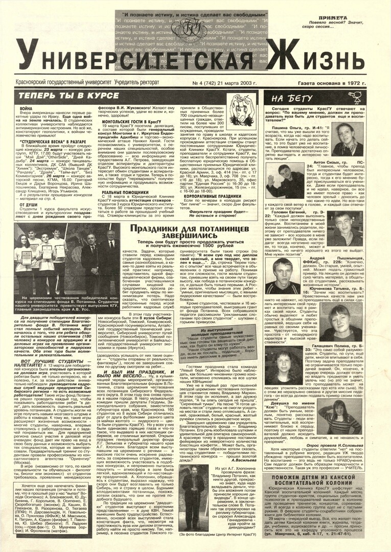 Университетская жизнь : газета/ Красноярский государственный университет. - Красноярск : КрасГУ, 1972 - - 2006 2003г. N 4 (742) (21 марта) Полный текст ( 19.2 Мб; PDF). Ресурс свободного доступа