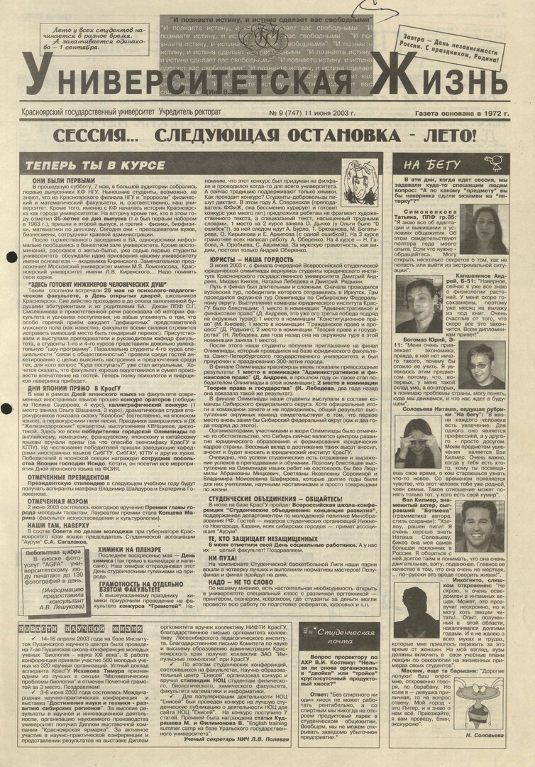 Университетская жизнь : газета/ Красноярский государственный университет. - Красноярск : КрасГУ, 1972 - - 2006 2003г. N 9 (747) (11 июня) Полный текст ( 10.5 Мб; PDF). Ресурс свободного доступа