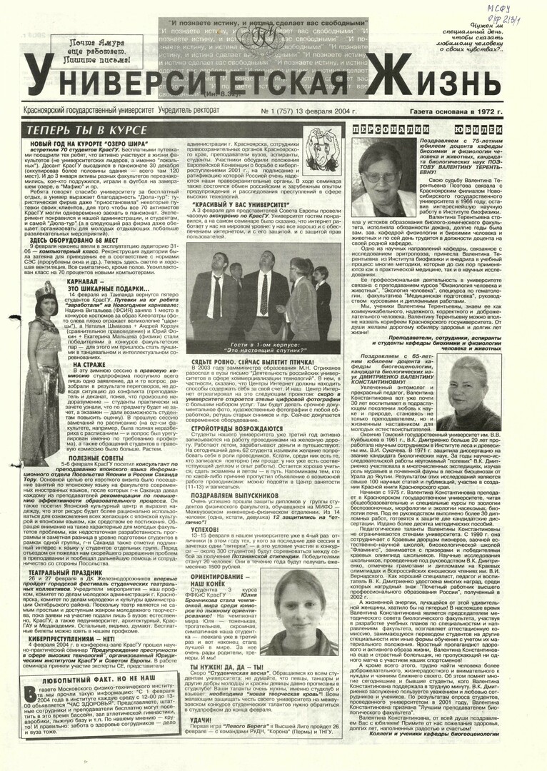 Университетская жизнь : газета/ Красноярский государственный университет. - Красноярск : КрасГУ, 1972 - - 2006 2004г. N 1 (757) (13 февраля) Полный текст ( 14.9 Мб; PDF). Ресурс свободного доступа