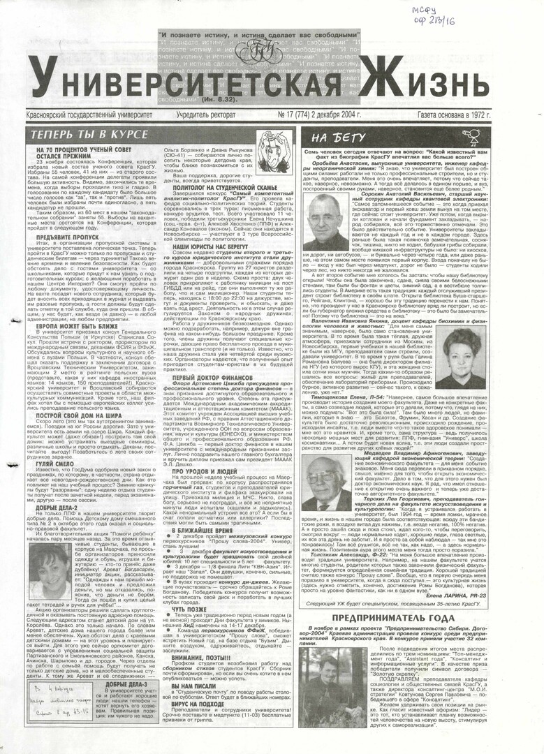 Университетская жизнь : газета/ Красноярский государственный университет. - Красноярск : КрасГУ, 1972 - - 2006 2004г. N 17 (774) (2 декабря) Полный текст ( 12.9 Мб; PDF). Ресурс свободного доступа