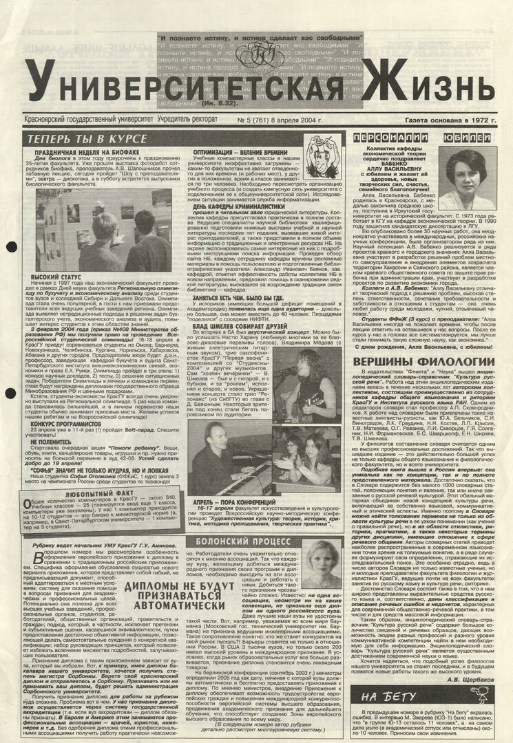 Университетская жизнь : газета/ Красноярский государственный университет. - Красноярск : КрасГУ, 1972 - - 2006 2004г. N 5 (761) (8 апреля) Полный текст ( 11.7 Мб; PDF). Ресурс свободного доступа