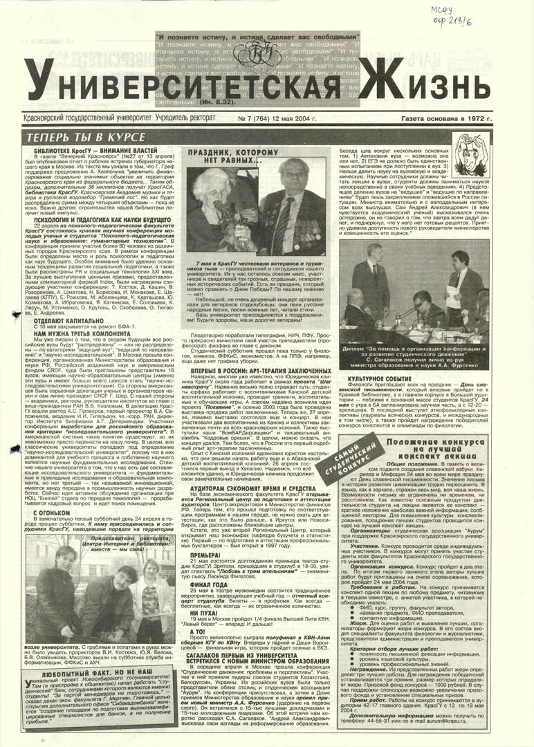 Университетская жизнь : газета/ Красноярский государственный университет. - Красноярск : КрасГУ, 1972 - - 2006 2004г. N 7 (764) (12 мая) Полный текст ( 14.7 Мб; PDF). Ресурс свободного доступа
