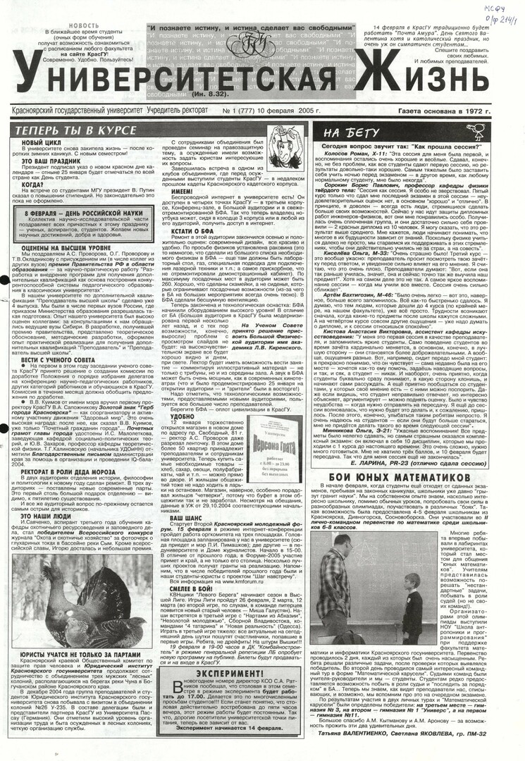 Университетская жизнь : газета/ Красноярский государственный университет. - Красноярск : КрасГУ, 1972 - - 2006 2005г. N 1 (777) (10 февраля) Полный текст ( 21.5 Мб; PDF). Ресурс свободного доступа