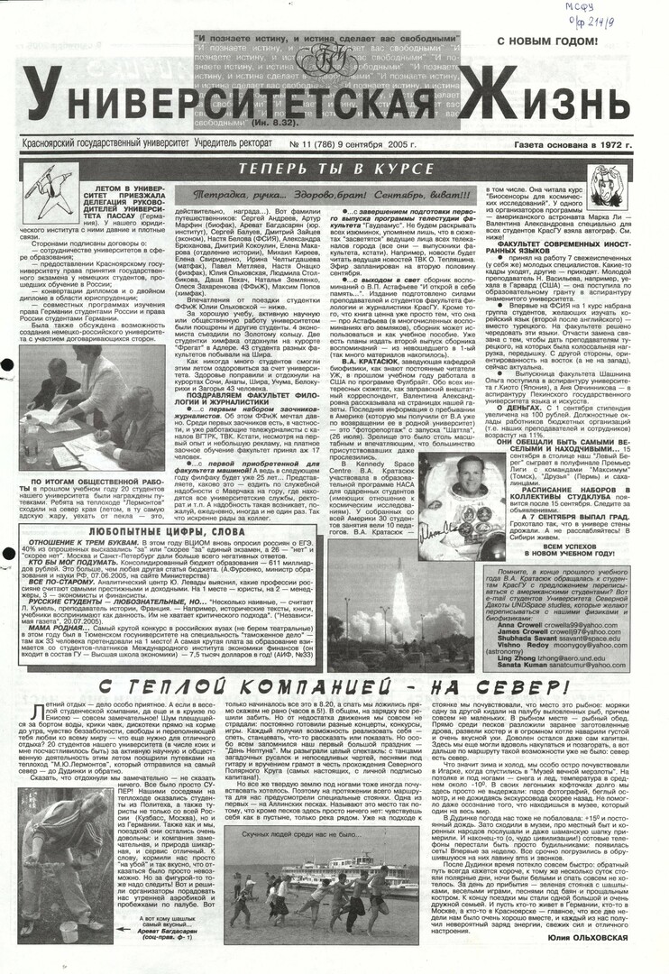 Университетская жизнь : газета/ Красноярский государственный университет. - Красноярск : КрасГУ, 1972 - - 2006 2005г. N 11 (786) (9 сентября) Полный текст ( 19.3 Мб; PDF). Ресурс свободного доступа
