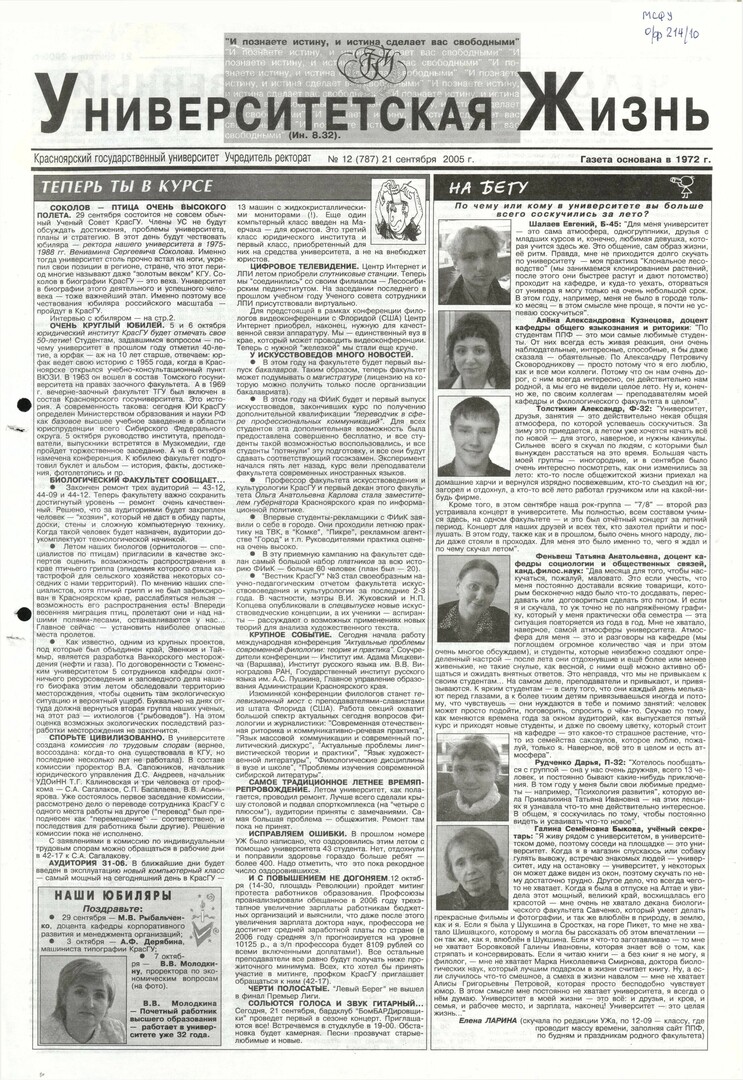 Университетская жизнь : газета/ Красноярский государственный университет. - Красноярск : КрасГУ, 1972 - - 2006 2005г. N 12 (787) (21 сентября) Полный текст ( 17.8 Мб; PDF). Ресурс свободного доступа