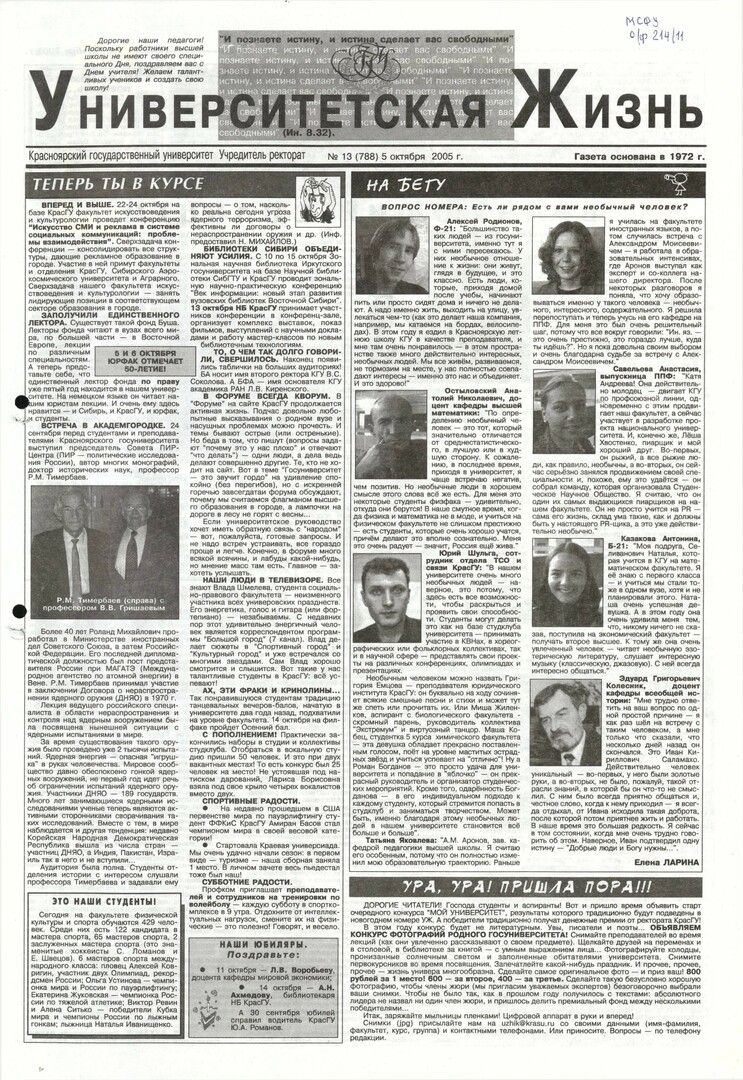 Университетская жизнь : газета/ Красноярский государственный университет. - Красноярск : КрасГУ, 1972 - - 2006 2005г. N 13 (788) (5 октября) Полный текст ( 19.1 Мб; PDF). Ресурс свободного доступа