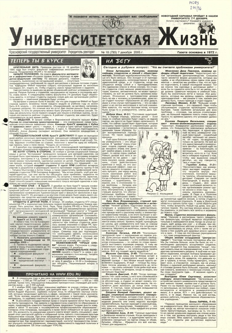 Университетская жизнь : газета/ Красноярский государственный университет. - Красноярск : КрасГУ, 1972 - - 2006 2005г. N 18 (793) (7 декабря) Полный текст ( 19.6 Мб; PDF). Ресурс свободного доступа