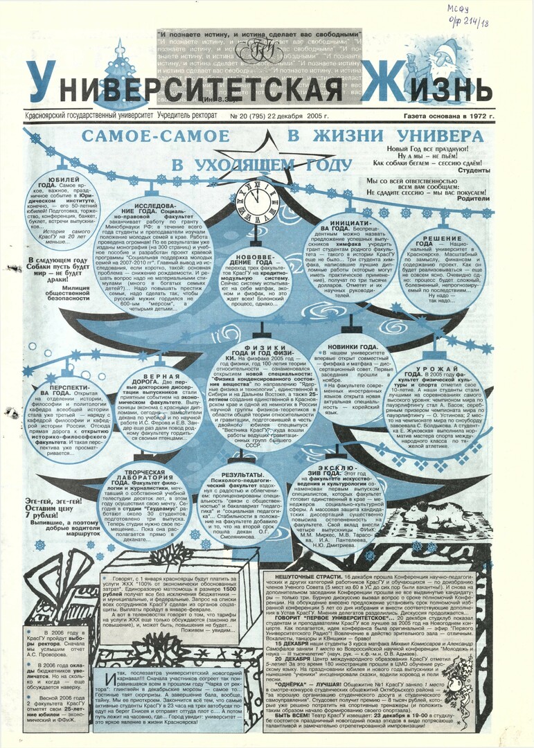 Университетская жизнь : газета/ Красноярский государственный университет. - Красноярск : КрасГУ, 1972 - - 2006 2005г. N 20 (795) (22 декабря) Полный текст ( 20.9 Мб; PDF). Ресурс свободного доступа