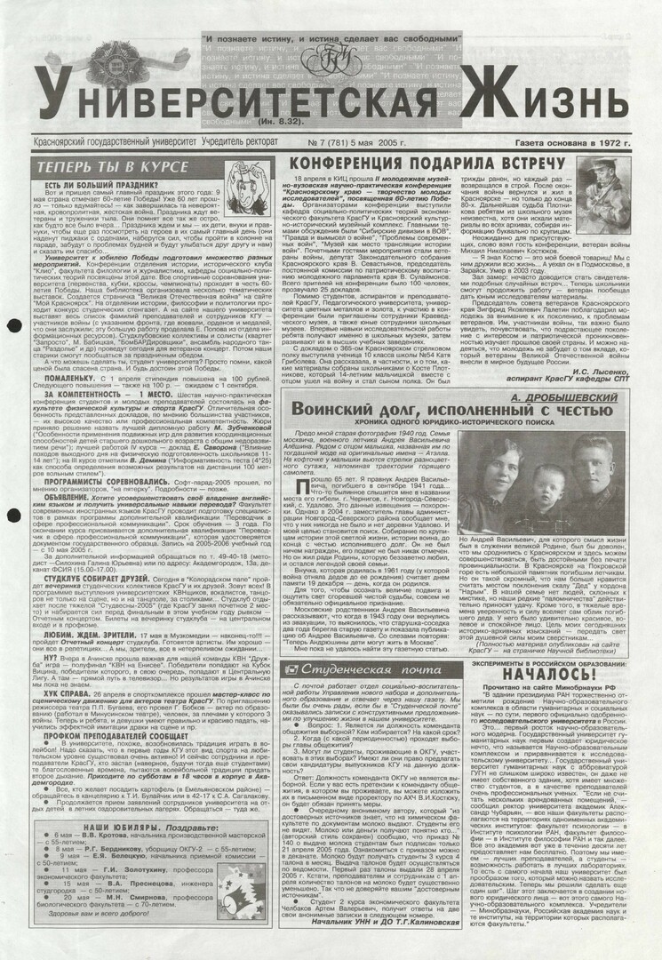 Университетская жизнь : газета/ Красноярский государственный университет. - Красноярск : КрасГУ, 1972 - - 2006 2005г. N 7 (781) (5 мая) Полный текст ( 10.9 Мб; PDF). Ресурс свободного доступа