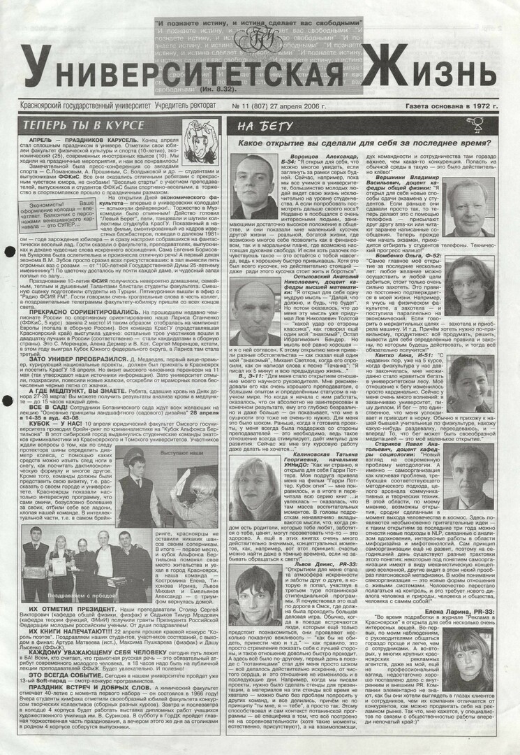 Университетская жизнь : газета/ Красноярский государственный университет. - Красноярск : КрасГУ, 1972 - - 2006 2006г. N 11* (807) (27 апреля) Полный текст ( 11.2 Мб; PDF). Ресурс свободного доступа