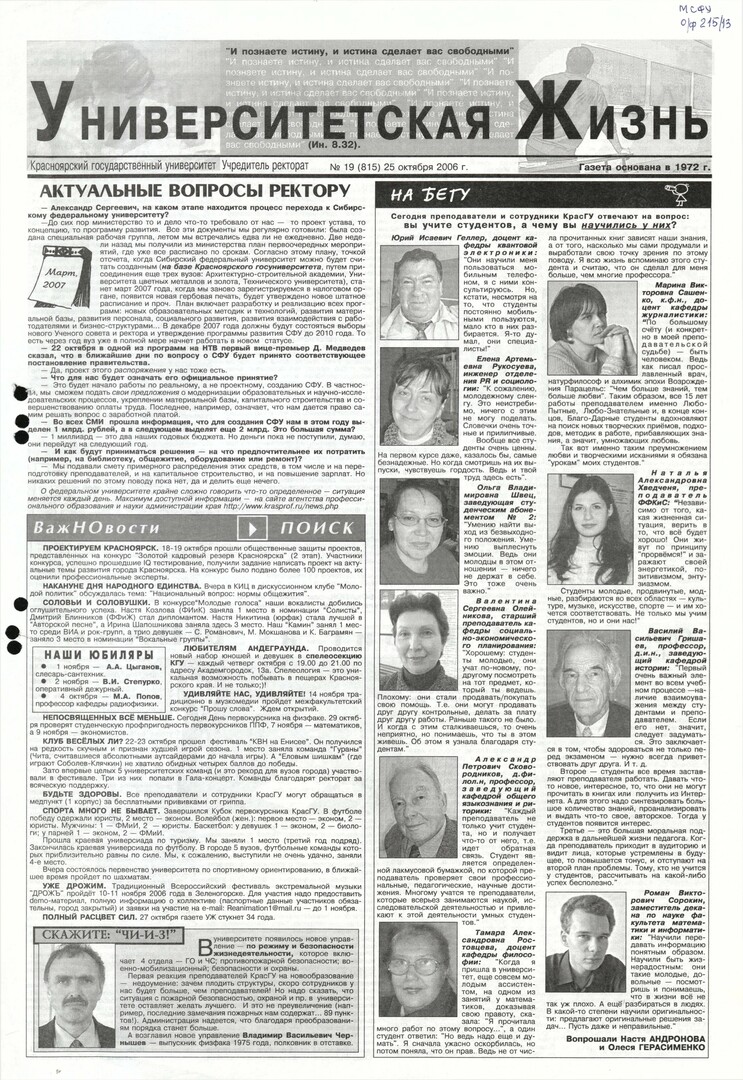 Университетская жизнь : газета/ Красноярский государственный университет. - Красноярск : КрасГУ, 1972 - - 2006 2006г. N 19 (815) (25 октября) Полный текст ( 18.2 Мб; PDF). Ресурс свободного доступа