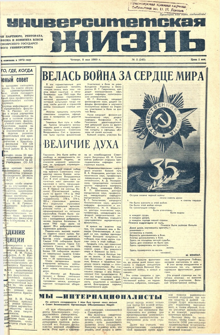 - Велась война за сердце мира. Величие духа : [об участии сотрудников КрасГУ в Великой Отечественной войне]. — С. 1.