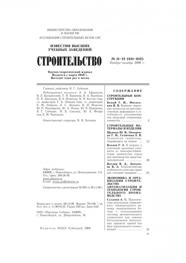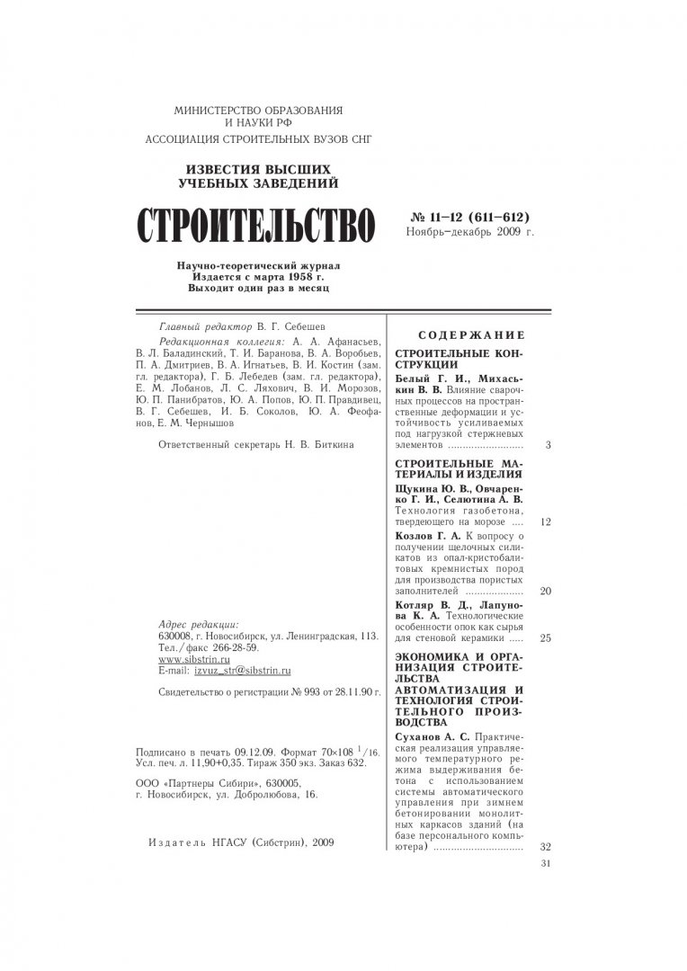 Библиографическое описание:Известия высших учебных заведений. Строительство : научно-теоретический журнал/ Ассоц. строит. вузов СНГ, Новосиб. гос. архит.-строит. ун-т. - Новосибирск, 1958 - . - ISSN 0536-1052. - Выходит ежемесячно 2009г. N 11/12